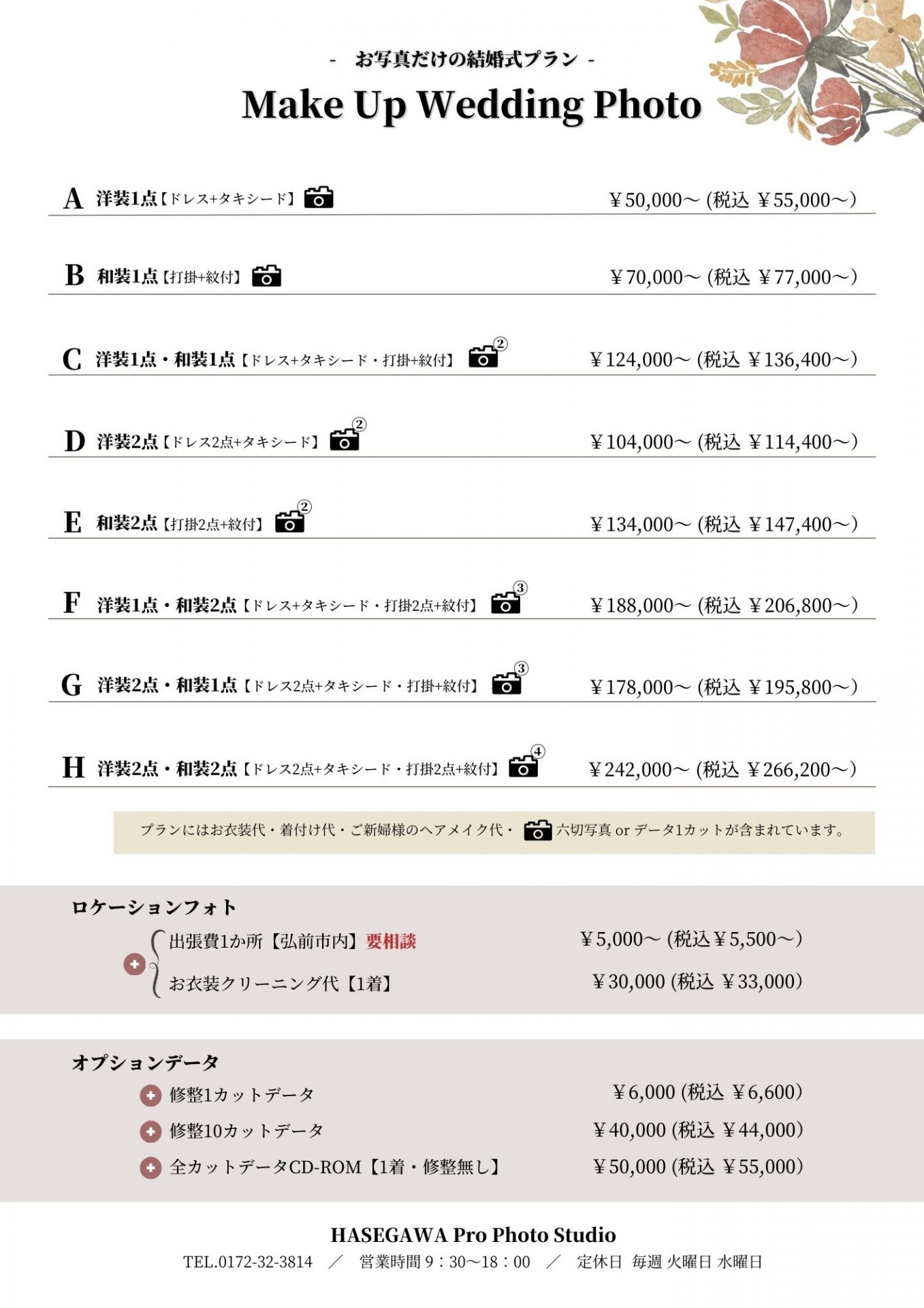 その他フォトブックなどの追加購入の料金はホームページトップの「Price」→「Wedding」へ一部料金が記載されてますので、そちらでご確認ください
